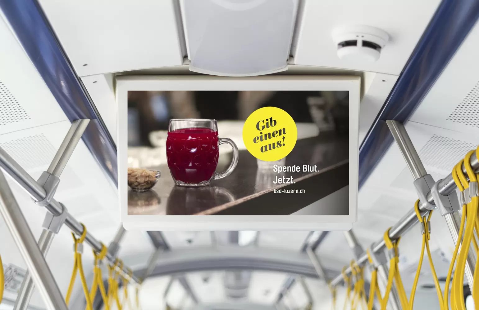 Bewusst provokativ mit einem Glas voller Blut und dem Spruch "Gib einen aus!" soll die Bevölkerung auf ihre Grosszügigkeit angesprochen und zum Mitmachen motiviert werden. So einfach und schnell wie man an der Bar mal eine Runde «ausgibt» kann man auch mal «eine Runde Blut spenden» und somit einem Menschen nicht nur für einen Abend etwas Gutes tun, sondern wortwörtlich sein Leben retten.